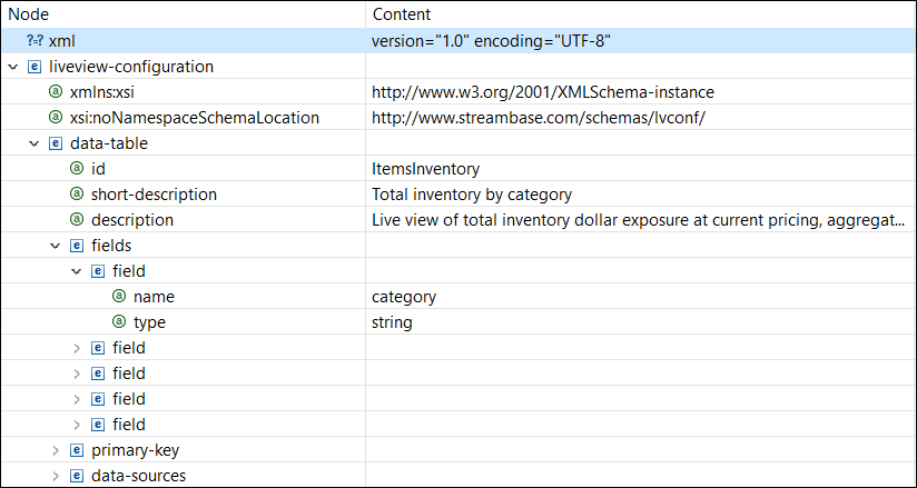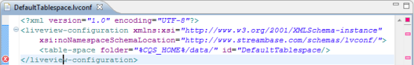 <liveview-configuration>element. These declarations are what direct the XML editor to Studio's internal copy of the lvconf file schema. Do not edit or remove the namespace declarations, or Studio may not be able to provide schema-aware assistance while editing. - Source View