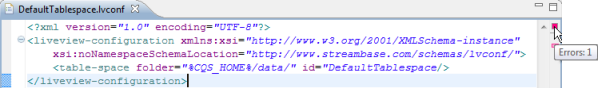 The XML editor typechecks your configuration file as you compose or edit it, and places a red location marker in the right margin to locate errors. Hover the mouse over the red square marker at the top of the right margin to see a count of the errors in the current file. Hover the mouse over red rectangles in the right margin to see a report of the error at that line.