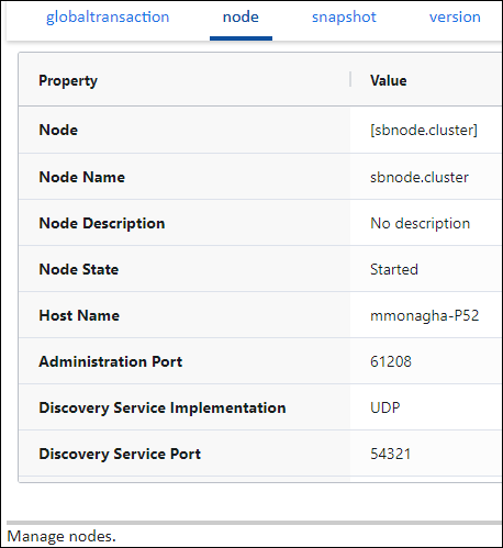The configuration tab in the right pane displays the properties and values applicable to the selected node-level managed entity.