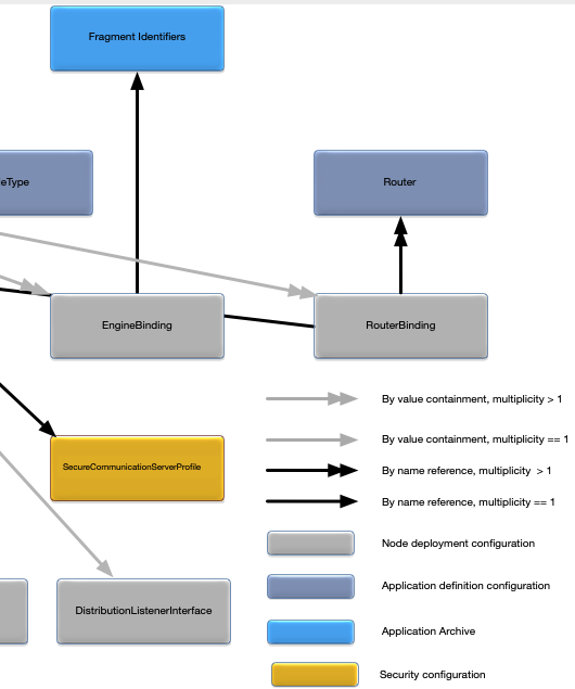 Figure 1, “Node deployment configuration map” shows a map of the relationships between all of the configuration objects in a node deployment configuration file. It also shows all external relationships to the application definition configuration and the application archive.