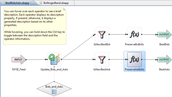 For the Filter operator, the tooltip displays the predicate (boolean expression) that corresponds to each output port.