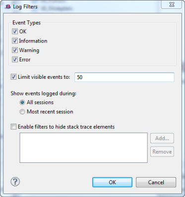 You can filter the view to show events of a particular type or session, or limit the number of entries in the view. To filter the current view, click the down-pointing arrowhead on the right of the Error Log view's toolbar to show the view's drop-down menu (there is no context menu equivalent). Select from the drop-down menu to show the Log Filters dialog.