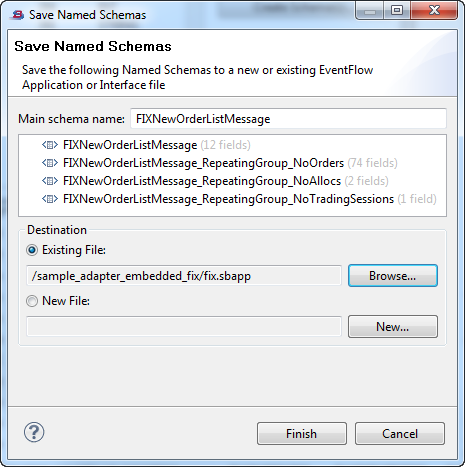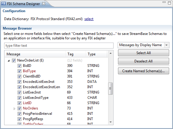 The FIX Schema Designer view provides a way to specify the FIX fields of interest for a set of FIX message types, to generate a set of StreamBase schemas for the selected fields, then save the generated schemas as named schemas in an EventFlow or interface file.