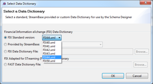 A drop-down list offers the data dictionaries for the FIX standard, versions 4.0, 4.1, 4.2, 4.3, 4.4, or 5.0. FIX 4.4 is the default selection for the dialog.
