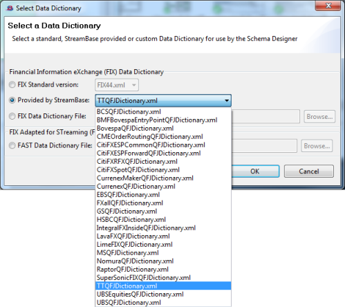 A drop-down list offers the data dictionaries for various StreamBase adapters. If you are designing schemas for use with a particular adapter, select the corresponding data dictionary.