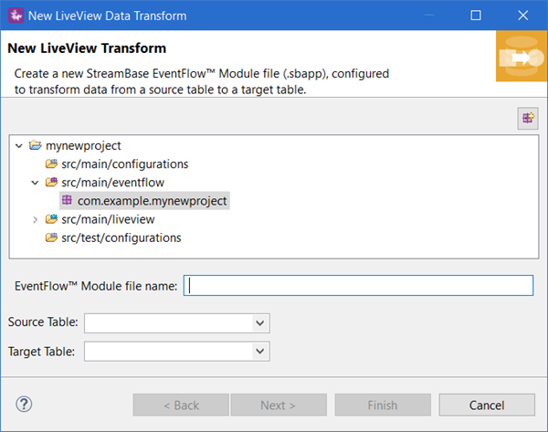 Use the New LiveView Transform wizard to create a transformation application that takes data from a Source Data Table, manipulates it, and places it into the Target Data Table. Both Source and Target tables must already exist in the project; create your Target table first, using the Data Table wizard.