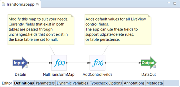 The wizard creates a simple Transform application that passes data unchanged from the Source table through a null EventFlow Map operator and onto the Target table. Replace the Map operator with the logic needed for your particular transformation.