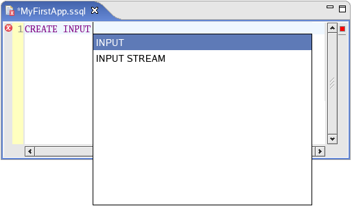 Displays a list of StreamSQL keywords and StreamBase functions that you can insert at the cursor. Note that the items in the list may vary depending on your context. Also, StreamSQL cannot help you choose among valid items: that depends on your module's functionality.