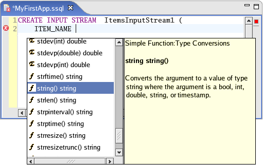 In the next screen, we have created an input stream, and entered the name of its first schema field, ITEM_NAME. Now we want to declare the field's data type, which we can do using a simple function. Perhaps we know the function we want, but want to check its exact name or its usage. We have pressed Ctrl+Space to display the Content Assist list, then scrolled down the list and selected the
