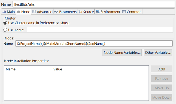 Settings made in this tab can only affect the next node that Studio installs and starts. Remember that Studio installs a node and reuses it for the next launch of the same fragment. So even though this tab is part of the configuration for one EventFlow module, if you add or change environment variables in this tab, for them to take effect, you must stop and remove any existing node for this fragment using toolbar buttons in the Clusters view. Then at the next launch of this configuration, Studio installs and starts a new node with the new environment settings.