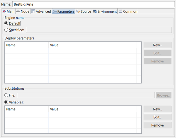 The next EventFlow fragment launch defined by this configuration has a default engine name generated by Studio. The Default setting is appropriate in the great majority of cases. You can see the engine name Studio chooses in the Clusters view at runtime. Select the Engine entry of a started node; the Name entry is near the top of the Properties list.