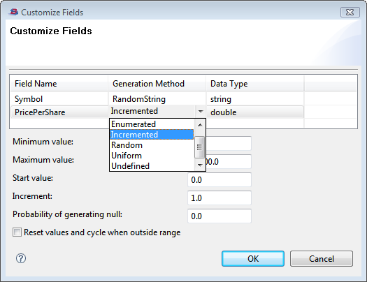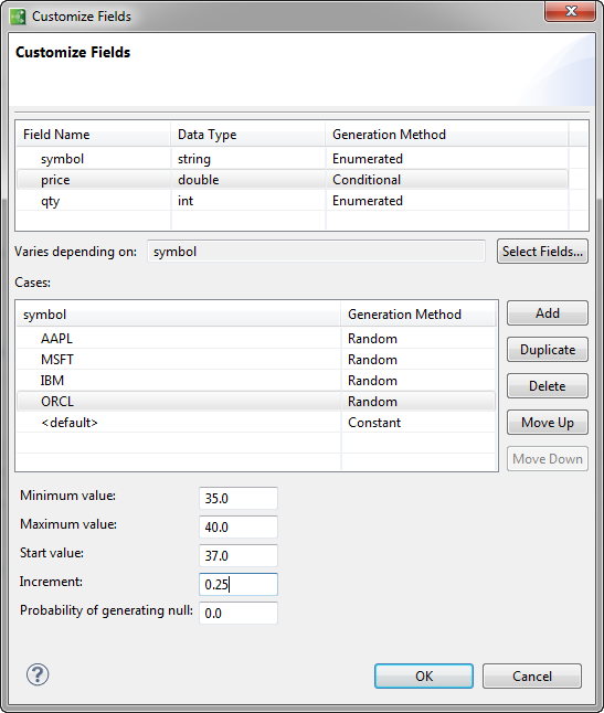 After you have specified the generation for price based on the AAPL symbol, you can save time by clicking the Duplicate button to clone that entry on the next row down. Use the drop-down symbol menu to select a different symbol, and then fill in the random value parameters appropriately for that symbol. The Customize Fields dialog for price now looks like this: