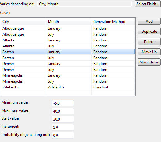 A random value is generated for the AvgTemp field (daytime average temperature for a given day) for each of these ten cases, based on parameters specified for each one. For example, the Boston-January combination has parameters: Minimum: -5° F, Maximum: 40° F, Start: 30° F, Increment 1° F, as shown below: