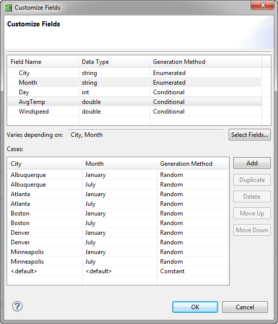Here is an example of a Customize Fields dialog in which temperature is based on five cities and two months of the year, which produces ten cases. If all 12 months were included, there would be 60 cases to specify.
