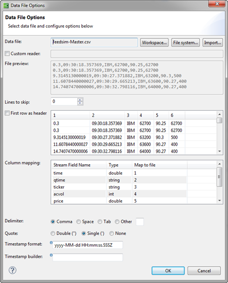 | Custom reader | None | Advanced. Select this check box to specify the fully qualified name of a Java class that implements a custom file reader for non-standard, proprietary, or binary files. The specified class must be on the classpath of the JVM running StreamBase Studio (or the JVM running the sbfeedsim command). See Feed Simulation with Custom File Reader for instructions on using this feature. | ||||||||||||||