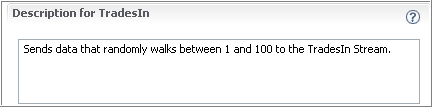 | Data rate | All generation methods. | 10 tuples per second (after an input stream and its schema are selected) | Specifies the number of tuples per second to be sent to the specified input stream. You can use the up and down arrows to change the value, or click into the text box and enter an integer. A feed simulation with a specification of zero tuples per second will not run. |