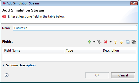 Let's say a StreamBase application has two input streams: TradesIn and FuturesIn. In the Simulation Streams section, click to invoke the Add Simulation Stream dialog. In the following example, we have identified the name of the additional input stream in the application: