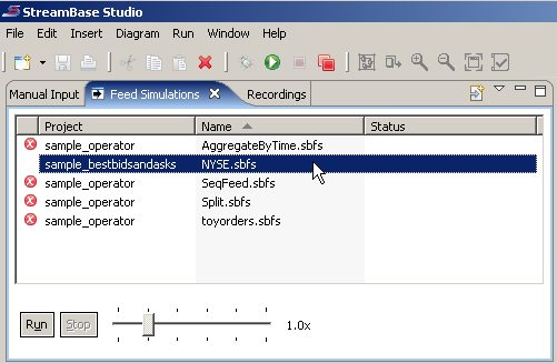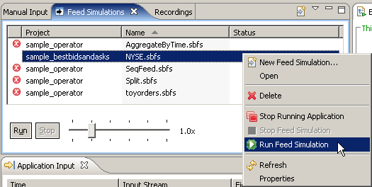 To run the NYSE.sbfs feed simulation, select it and click the button. Another way to start it is to right-click the feed simulation file name, and select Run Feed Simulation from the drop-down menu.