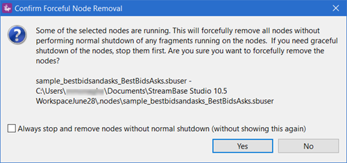 Forcefully removes the selected node. If you select a node that is currently started, and contains an EventFlow or LiveView running fragment, Studio prompts for confirmation: