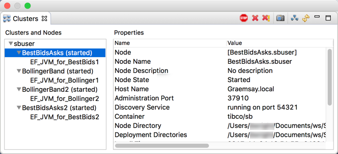 StreamBase Studio installs and starts nodes dynamically and automatically when you ask Studio to run or debug an EventFlow or LiveView fragment. By default, Studio installs nodes into a single cluster named the same as the system login name of the user who started Studio. So, by default, the Clusters view shows only the nodes installed by Studio.