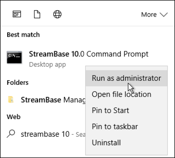 Right-click the StreamBase 11.0 Command Prompt entry and select Run as administrator from the context menu.