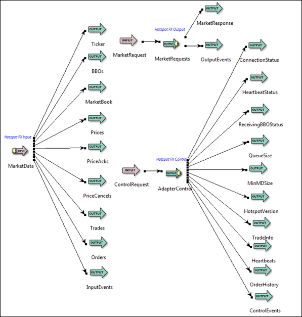 The Hotspot FX output adapter icon has one input port for submitting market requests (bid, offer, buy, sell, and so on) and one output port on which a tuple is emitted with these requests.