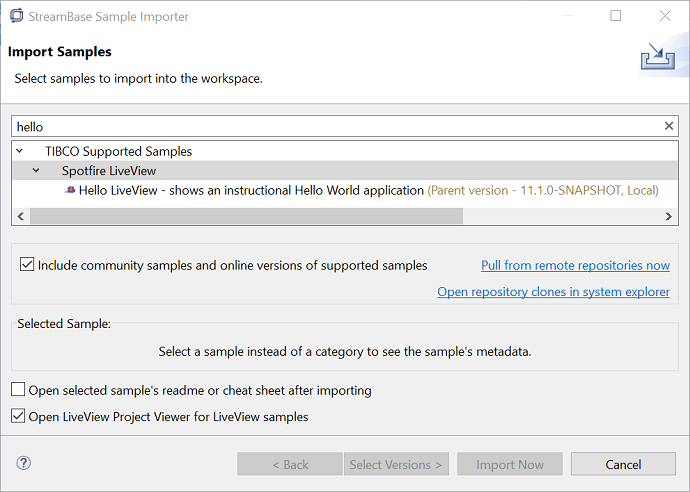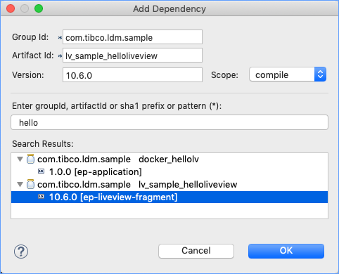ep-liveview-fragmententry (perhaps because your local Maven repository has artifacts from previous StreamBase releases), select the entry whose version number matches the current StreamBase release.Click .