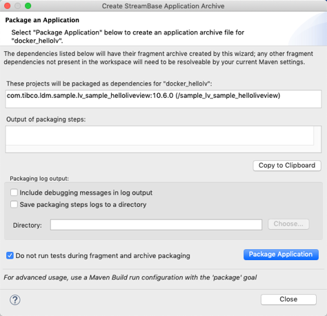 This tutorial page describes how to use StreamBase Studio and, optionally, the mvn command to build a runnable archive of a StreamBase Application with LiveView fragment, then automatically package and install that archive into a Docker container.