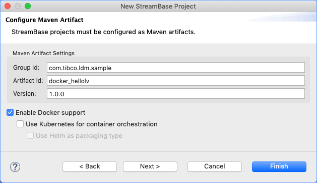 com.tibco.ldm.sampleto match the first part of the Group ID of the fragment sample as determined in step 1. (You are not required to use the same Group ID for an Application project as for its dependent fragment projects, but doing this brings clarity to the process.)Select the Enable Docker support check box. This is the entire difference between building an application that runs locally and one that runs in a Docker container.