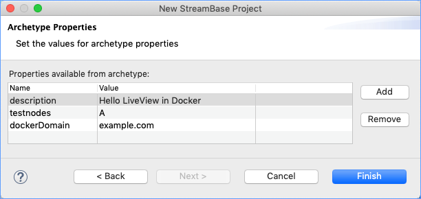 Property Default Description description My ApplicationEnter any text to characterize this application and distinguish it from other applications in your network. This string ends up in the <description>element of your application project'spom.xmlfile.testnodes A,B,CSpecify one or more node names for test nodes that are started when you run Maven Test or another Maven goal that requires Test. You can reduce project build time at the expense of test coverage by replacing the default three nodes, A,B,Cwith justA.dockerDomain example.comSpecify a domain name that will allow your Docker containers to communicate with each other. The domain name you specify here is configured into a TrustedHostsconfiguration file for this application. This allows all StreamBase Runtime nodes to participate in the same domain as the Docker containers, which allows node-to-node communication to occur without user authentication for nodes in the same Docker network. Members of this domain will be trusted hosts for each other.To take advantage of this feature, use the
