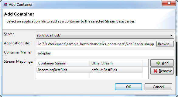 Adds a new container to the selected server, analogous to the sbadmin addContainer command. You must specify a name for the new container and the full local path to a StreamBase application file to run in the new container.
