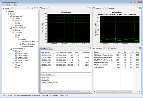 StreamBase Manager lets you view statistics about the CPU, memory, and parallel region utilization of your StreamBase Server processes and the application components they are hosting. StreamBase Manager is available in two forms: