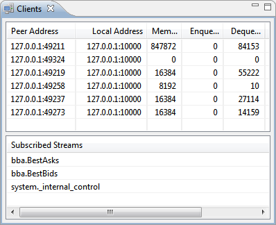 Shows statistics for the client connections to your running StreamBase application, which includes sbc enqueue and sbc dequeue clients as well as custom client applications you have written with the StreamBase Client API. Select a client row to see its subscribed streams in the bottom portion of the view.
