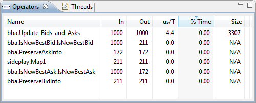 The Threads View is an advanced view that shows information about threads used by components in the currently selected StreamBase application. This view is of particular interest when your application uses the data concurrency option for operators and adapters. See the Execution Order, Concurrency, and Parallelism page in the Authoring Guide for more on using parallel execution.