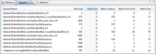 The Queues View is an advanced view for troubleshooting complex StreamBase applications that use concurrency features or container connections between modules. For applications that do not use those features, this view shows your application's input and output streams, including control streams in the system container, and generally shows 0 in the Latest Size column and 1 in the Max Size column.