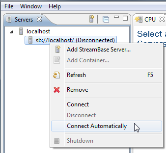 Connects to the selected server URI and stores persistent connection information; statistics from that server begin to display when the connection is made. If the connected server goes down and restarts, StreamBase Manager automatically reconnects and continues monitoring. If you exit and restart StreamBase Manager later, you only need to select the server's entry in the Servers View to reestablish the connection.