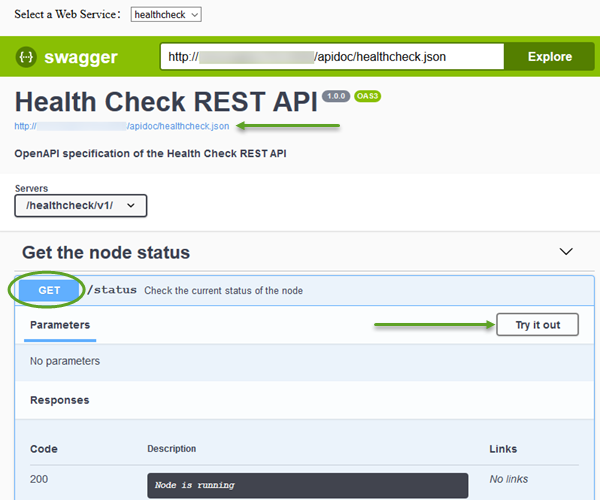 Click , supply the requested inputs, then click . Notice the node status in the Response body.
