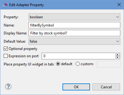 An adapter property is a Java property for your adapter. For each property you specify, the wizard generates code to place a control in the Adapter Properties tab of the Properties view for your adapter. After you add implementation code to the generated stub code, the end-user of your adapter can use these controls to modify the operation of your adapter.