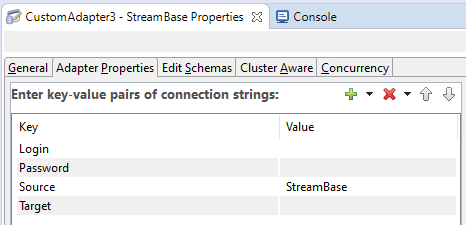 Schema Edit Schemas tab The Properties view for the new adapter or operator is augmented with a standard Edit Schemas tab as used throughout StreamBase. Use this to specify the schema for the field whose name you specify in the Name field of the New Adapter Property dialog. The Properties view tab generated has the title Edit Schemas if you select the default control in that dialog, or you can specify a different tab title with the custom control.