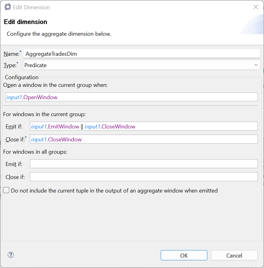 true, thus triggering a window to close or emit a tuple. Conditions in the operator might or might not cause a new window to be opened when one is closed.With this checkbox cleared (the default state), the values of the triggering tuple are included in the calculation of the value emitted from the window. This is the default behavior. Field, Tuple, and Time dimensions do not have this option.