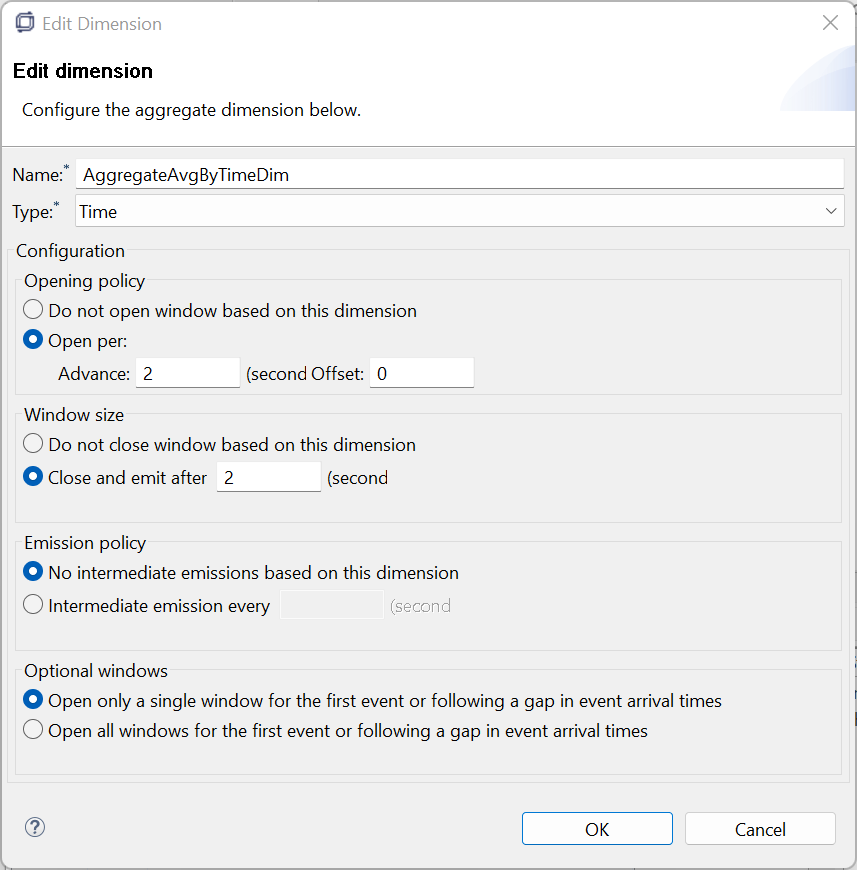 An aggregate is set with the dimension for window opening and closing to 60 seconds (Advance 60, Close and Emit 60), with no intermediate output.