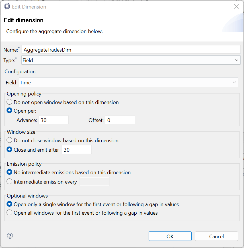 | Field | The dropdown list for this field shows all fields in the incoming schema that have the StreamBase data type of int, double, long, or timestamp (interpreted as an interval timestamp in seconds). Base the dimension only on input fields you know will contain monotonically increasing values. |