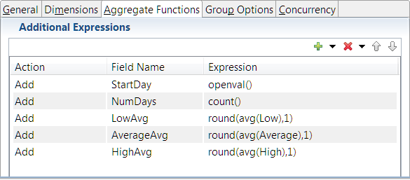 openvalis the largest Advance + Offset that is less than or equal to that first value. The operator emits tuples when windows contain seven tuples. That is, the first emission occurs when the eighth input tuple is received. The StartDay output field, which is the dimension'sopenval, begins with the first value of the Day field. For a certain input stream, the output starts off as follows:StartDay=1 NumDays=7 LowAvg=64.4 AverageAvg=70.1 HighAvg=78.0 StartDay=2 NumDays=7 LowAvg=64.7 AverageAvg=70.7 HighAvg=78.3 StartDay=3 NumDays=7 LowAvg=65.4 AverageAvg=72.4 HighAvg=79.9 ...