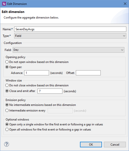 To produce weekly moving averages, the field dimension Opening policy should advance one day at a time, based on integer field Day, and have a Window size of 7 days, with no intermediate emissions. The Edit Dimension dialog looks like this: