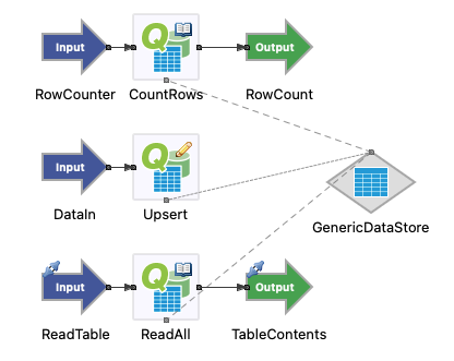 More than one operator can be connected to the same data construct. The data arc from each operator has a line style that indicates how the operator uses the query table. See the styles displayed in Using the Query Operator and in the example in Using the Query Table Data Construct that shows six Query operators connected to the same Query Table.