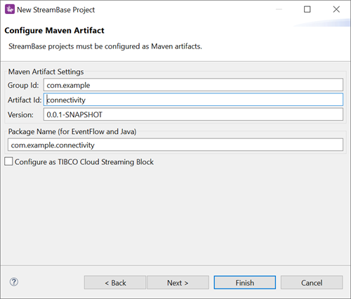Artifact Id: Studio assigns an artifact ID based on the project name that you chose in the first panel.