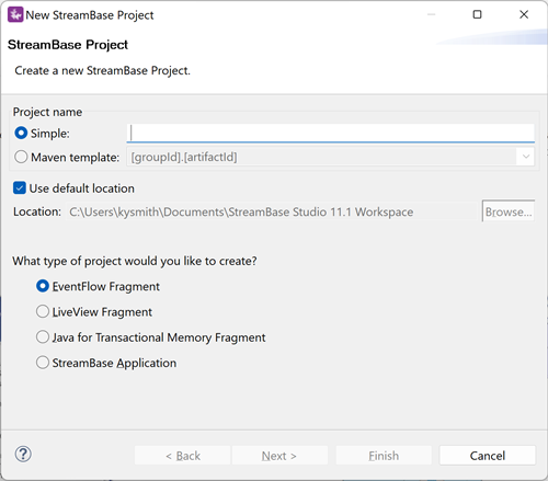 By default, StreamBase Studio creates your project in your current Studio workspace, which is the recommended location.