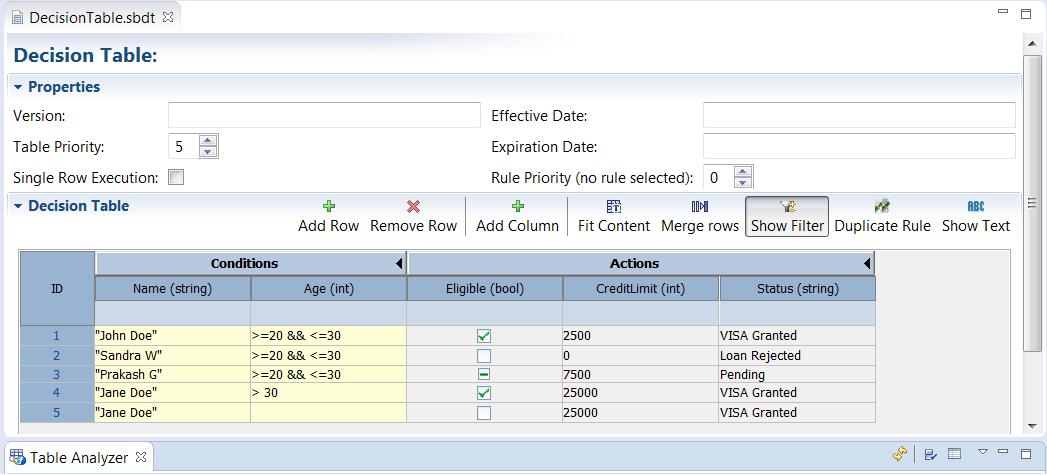 .sbdtdecision table on the Studio canvas and make sure the Table Analyzer tab is active.