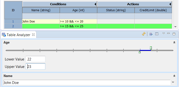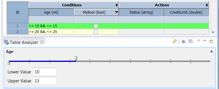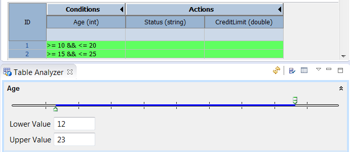 The preference (see Decision Table > Analyzer Panel) determines whether rows whose condition falls completely or partially within the specified condition range are highlighted.