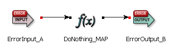 The output port of an Error Input Stream must be connected to another component. The simplest use of an Error Input Stream is to connect its output to a Map or Filter operator, whose output is then connected to an Error Output Stream. This configuration of three components can remain in the canvas alongside the other operators of your module. This configuration, illustrated in the following figure, means: enqueue all otherwise unhandled errors in this module at ErrorInput_A, and map its output unchanged to the input of ErrorOutput_B. Error tuples received at ErrorOutput_B are sent to the containing module's Error Input Stream.
